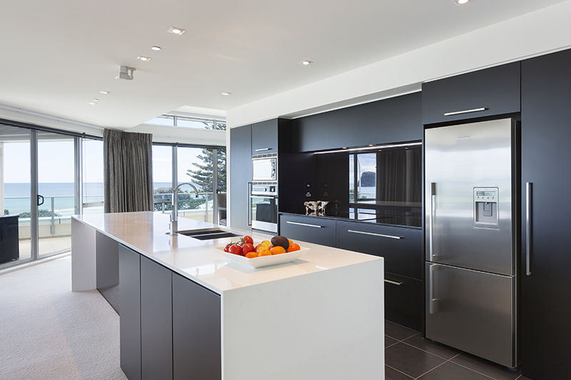 With my inner need to make all things functional and beautiful I was definitely up for the challenge. The client brief was simple, the only restriction to the Mount Maunganui beach front penthouse apartment were the exterior walls. The existing floor plan was a poor use of space, the interior dated and tired so the decision was made to gutt the apartment and start with a clean slate. Many many many concepts later we found the solution; open plan living pivoting around the central kitchen with direct access to the deck creating the hub of the home, a hidden office space incorporated into the dining room, 2 bedrooms and 2 bathrooms all in a striking monochrome palette perfect for showcasing the undeniably stunning view of the beach.