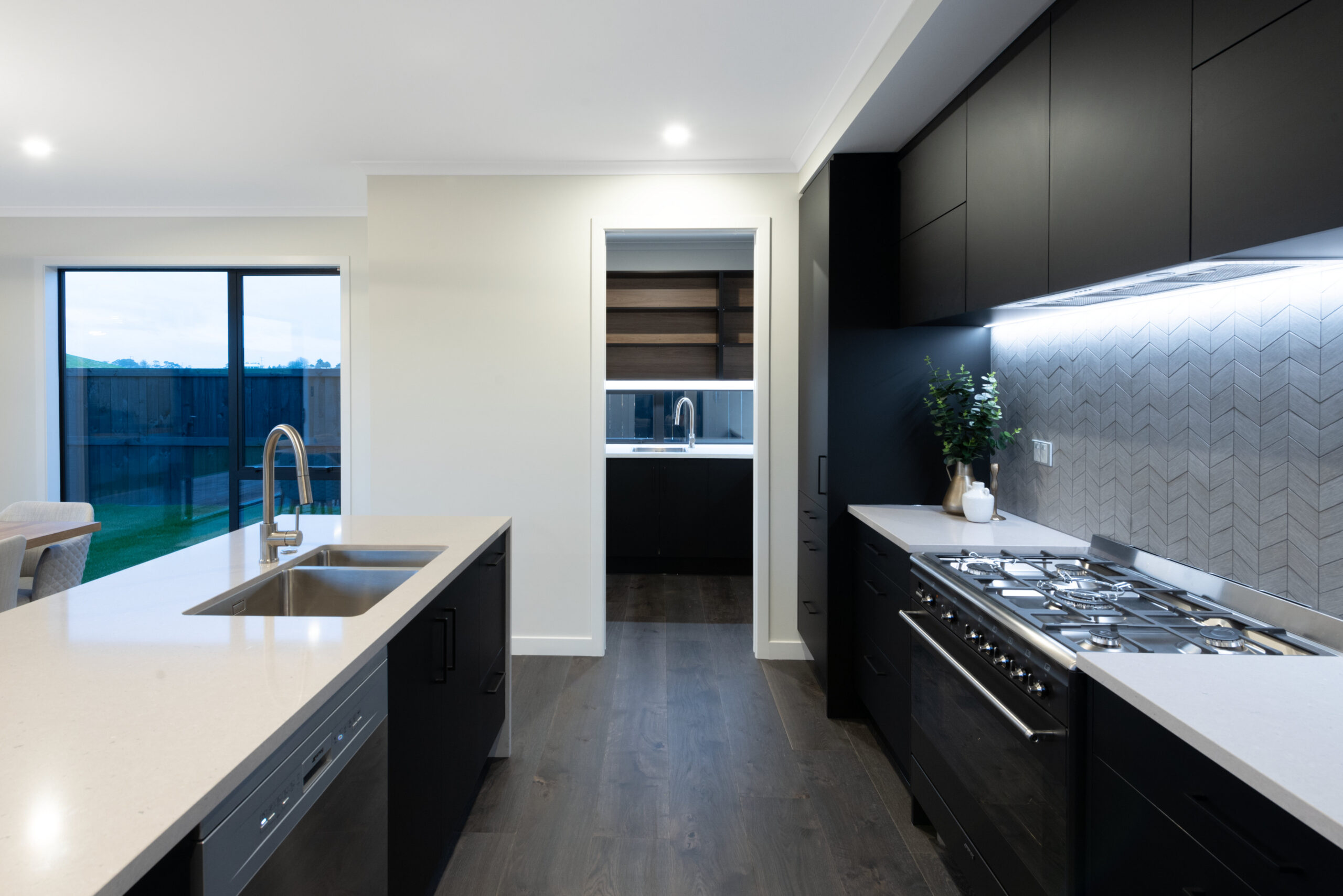 External corner sliding doors allow a seamless transition from the family room to the north facing covered living area which provides shade in the summer and shelter in the winter. The interior palette was driven by the architectural features of the impressive 2 story home. Working along side the Mike Greer team we curated a moody industrial interior, the depth of colour was balanced by the light filled spaces. The entrance features an impressive Oak open tread stairwell, the Oak flooring continues through to the open plan living and compliments the matt black kitchen cabinetry. A sprinkle of metallic wallpapers and an oversized barn door add texture and depth.