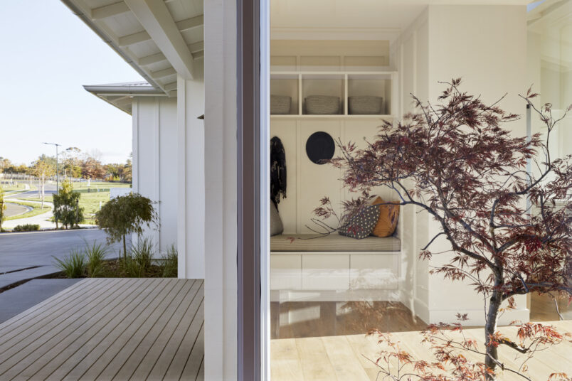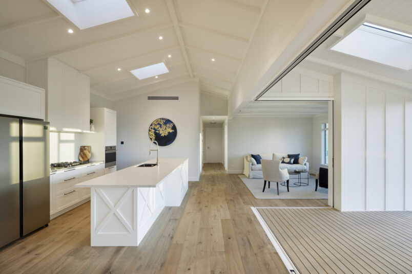 Design Builders light filled new show home overlooks the Omokoroa Golf course. Within the white on white interior lie layers of fine detailing, subtle wallpapers, hand finished feature walls, wool carpets and timber flooring
