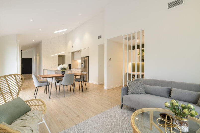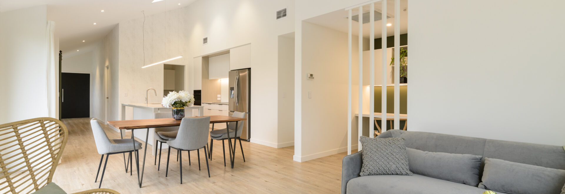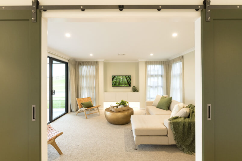 Ultimate Homes latest show home situated at 129 Whakaturou Crescent, The Lakes has a clean Scandinavian aesthetic with a shot of rich olive green. With a focus on natural fibre the home feels warm and inviting, open plan living areas are light drenched and feature Designers Guild wallpapers reminiscent of distressed plaster work adding texture to the white on white interior